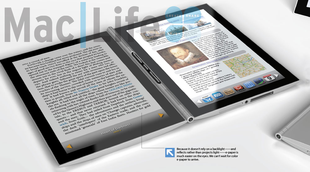 Немного переделанный концепт Таблетки с примесями Microsoft’овской книжки. Два экрана на 8″, мульти-тач, полноцвет.